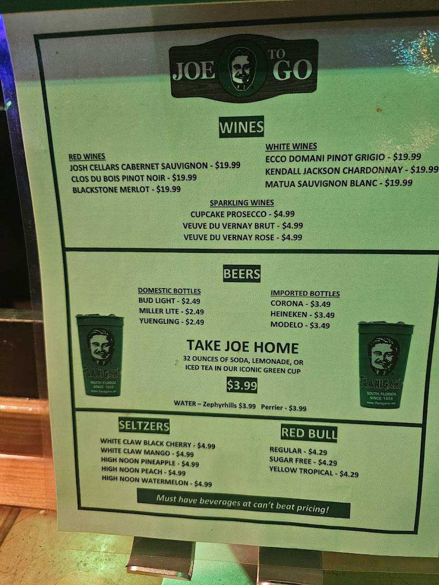 Your experience wouldn’t be complete without sampling from Flanigan's extensive drink menu, featuring everything from cocktails and bottled beers to an array of liquors, including Grey Goose vodka and Grand Marnier cordial. Don’t forget to enjoy your drink from Flanigan's iconic green souvenir cup – a delightful reminder of your time spent here. Whether you're in the mood for a refreshing beer or a unique cocktail, there's something here for everyone.